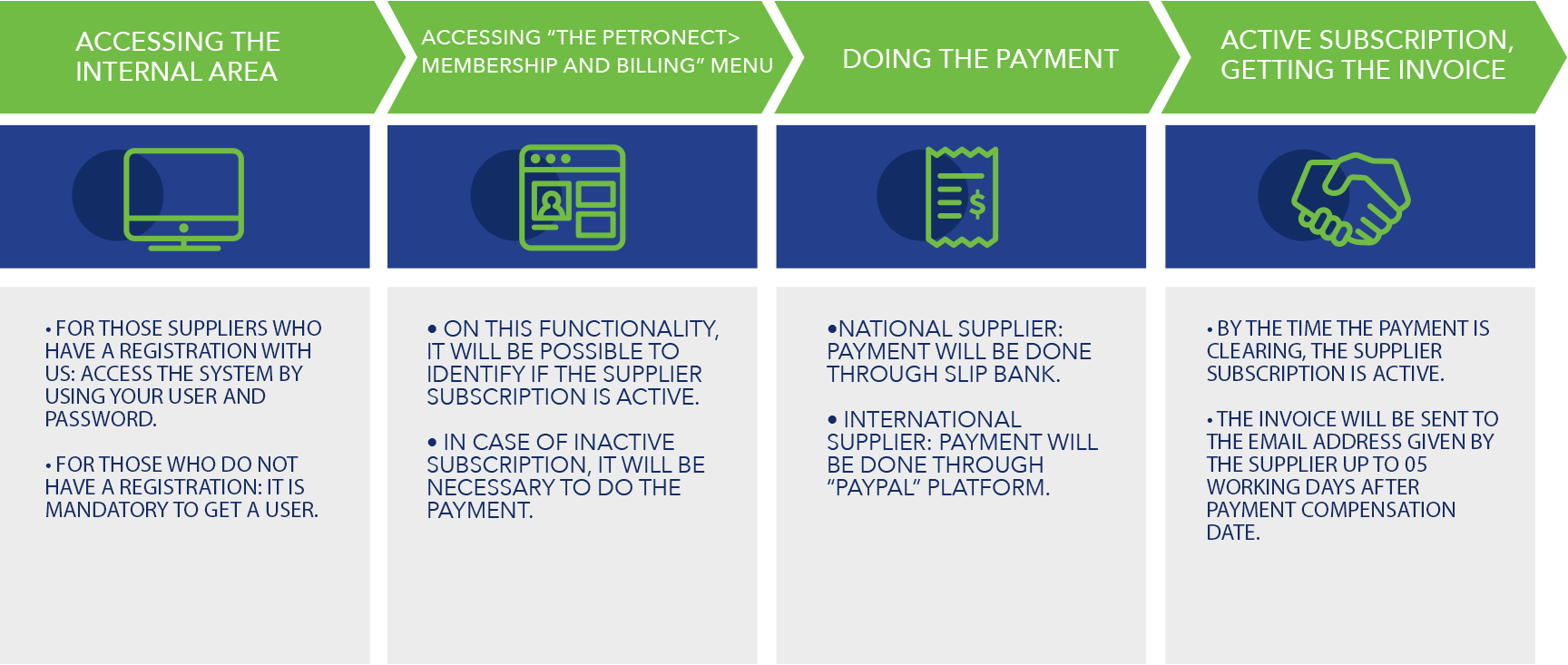 IN FORCE SINCE JULY 2018, THE ACCESS FEE IS PAID BY THE SUPPLIER INTERESTED IN PARTICIPATING IN A PUBLIC BIDDING OF THE PETROBRAS SYSTEM. BY PAYING THE SUBSCRIPTION, THE SUPPLIER WILL BE ABLE TO ACCESS AND PARTICIPATE IN THE PUBLIC BIDS AVAILABLE IN THE EXTERNAL AREA OF THE PETRONECT PORTAL.